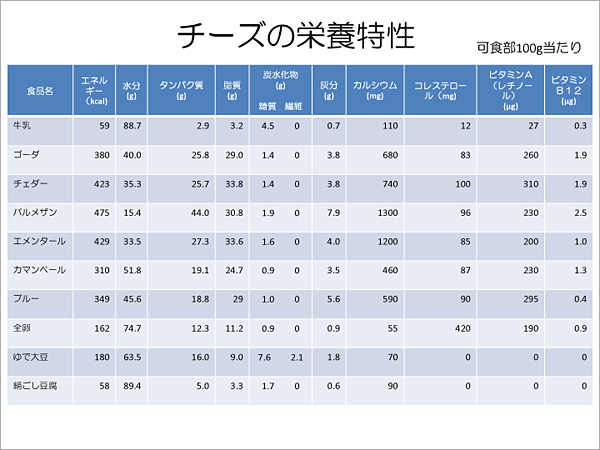 チーズの栄養特性は、下表を見て頂くとお分かりになると思います。