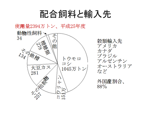 日本の家畜というのは、言ってみれば穀類に依存して生産されている。それもほとんど外国産。これは平成25年度の使用量なのですが、これは全部合計しても生産量と同じで、約2,400万t。米の約3倍以上です。家畜の食べる飼料というのは、実は米の3倍ぐらいあるのです。2,400万tのうちの88%、これは農林水産省が言う数字で、それまでは90%だったのですが、なぜ急に2%も下がったのか私、よく理由は分かりませんが、でも9割ぐらいは全部外国産だということが分かるかと思います。ここに一つ危険性が潜んでおります。